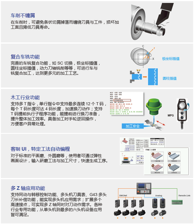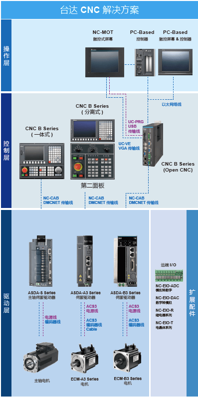 臺達新一代CNC B系列數控系統,根據客戶需求和市場趨勢,整合HMI 平臺操作界面,可依照企業及行業需求,彈性化客制操作界面;并可搭配臺達伺服驅動器 ASDA-A3 / ASDA-B3 系列、永磁主軸系統及交流電機驅動器驅動主軸,以及通訊網絡 DMCNET 等進行高速數據傳輸及控制,達到控制機床的電機定速、定轉矩與精密定位。