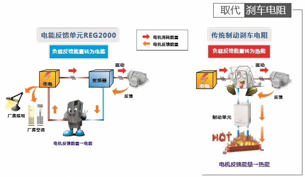 替代制動煞車電阻,降低熱損失、節省能源消耗與空間費用。